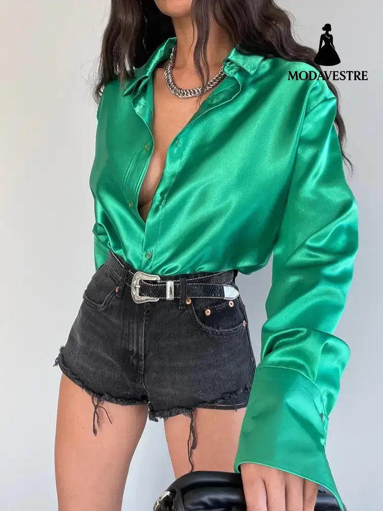 Single-breasted Long Sleeve Lapel Shirt Sexy Women Clothing Green / L