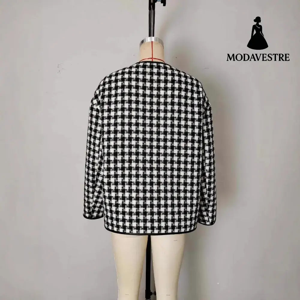Metal Buckle Decorative Round Neck Hemming Shorts Jacket Black And White Plaid / L Jacket