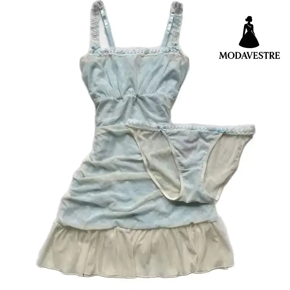 Lace Trim Summer Sleepwear Set – Light Blue Dress & Panty Light Blue / S