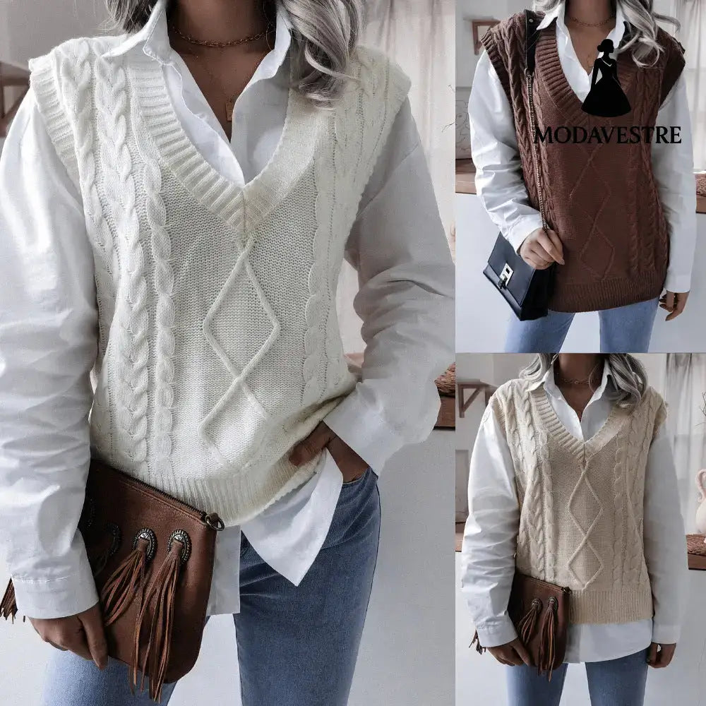 Women’s V-neck Fried Dough Twist Casual Loose Knit Sweater Vest Women’s Clothing