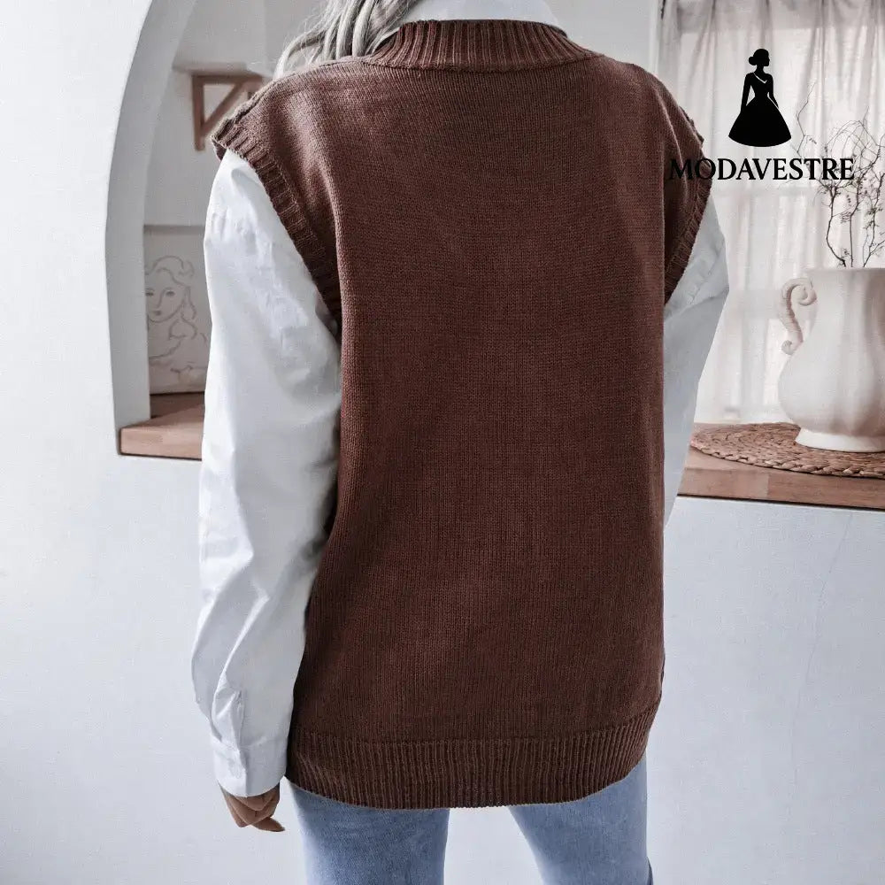 Women’s V-neck Fried Dough Twist Casual Loose Knit Sweater Vest Coffee / L Women’s Clothing