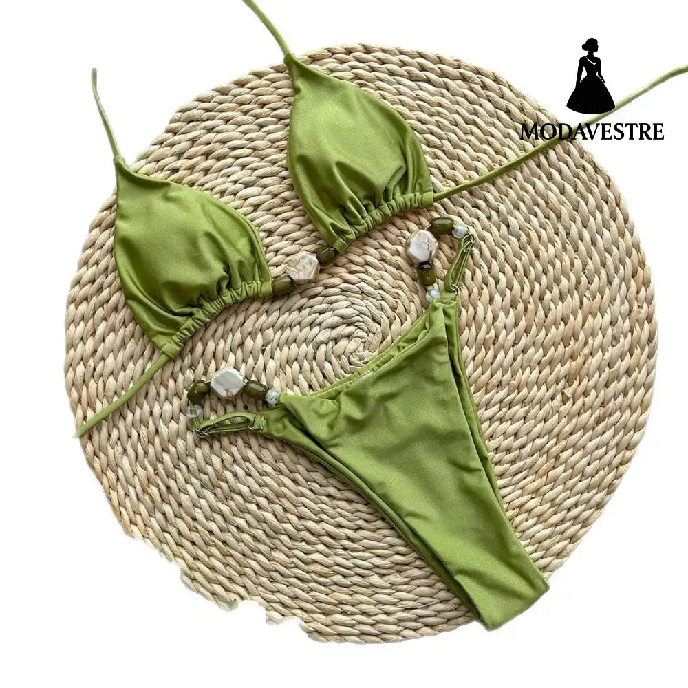 Glossy Brown Pearl Bikini Set – Elegant Two-Piece Women’s Swimwear C3991 Glossy Green / S