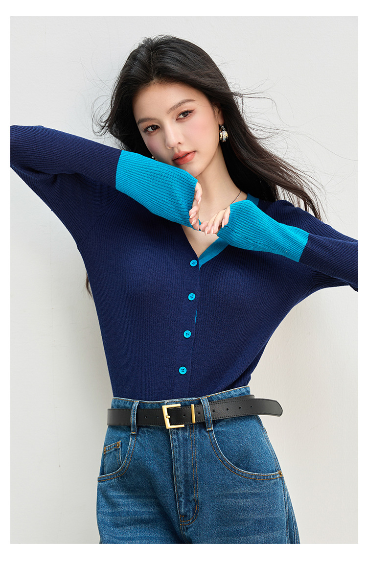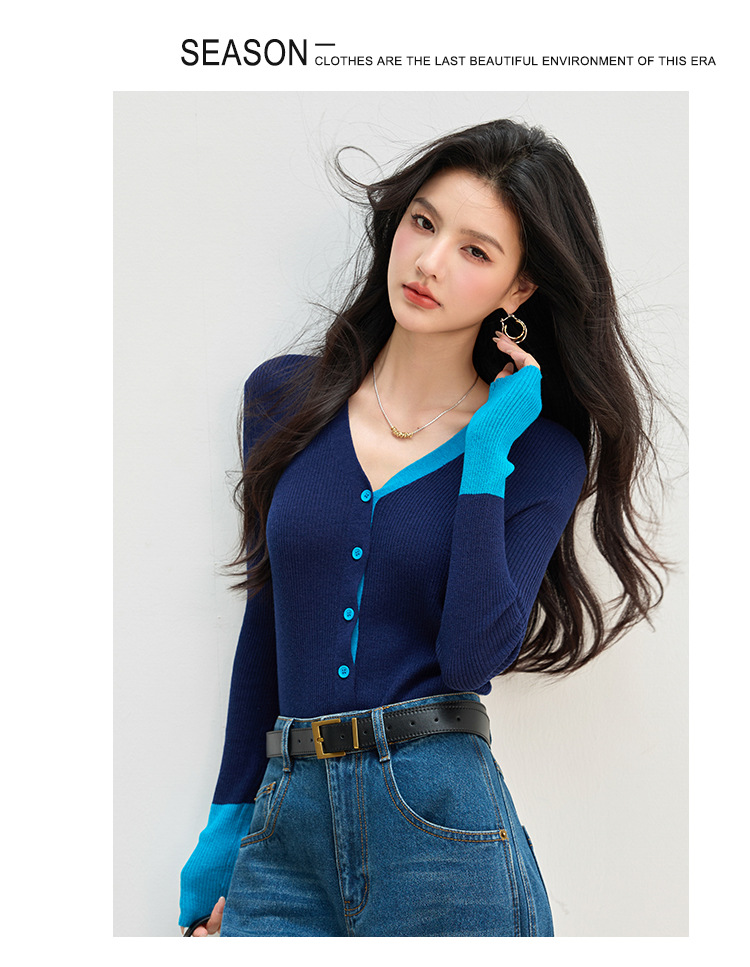 Patchwork V-neck Knit Cardigan for Women Early Autumn Blue Faux Two-piece TopOuterwear