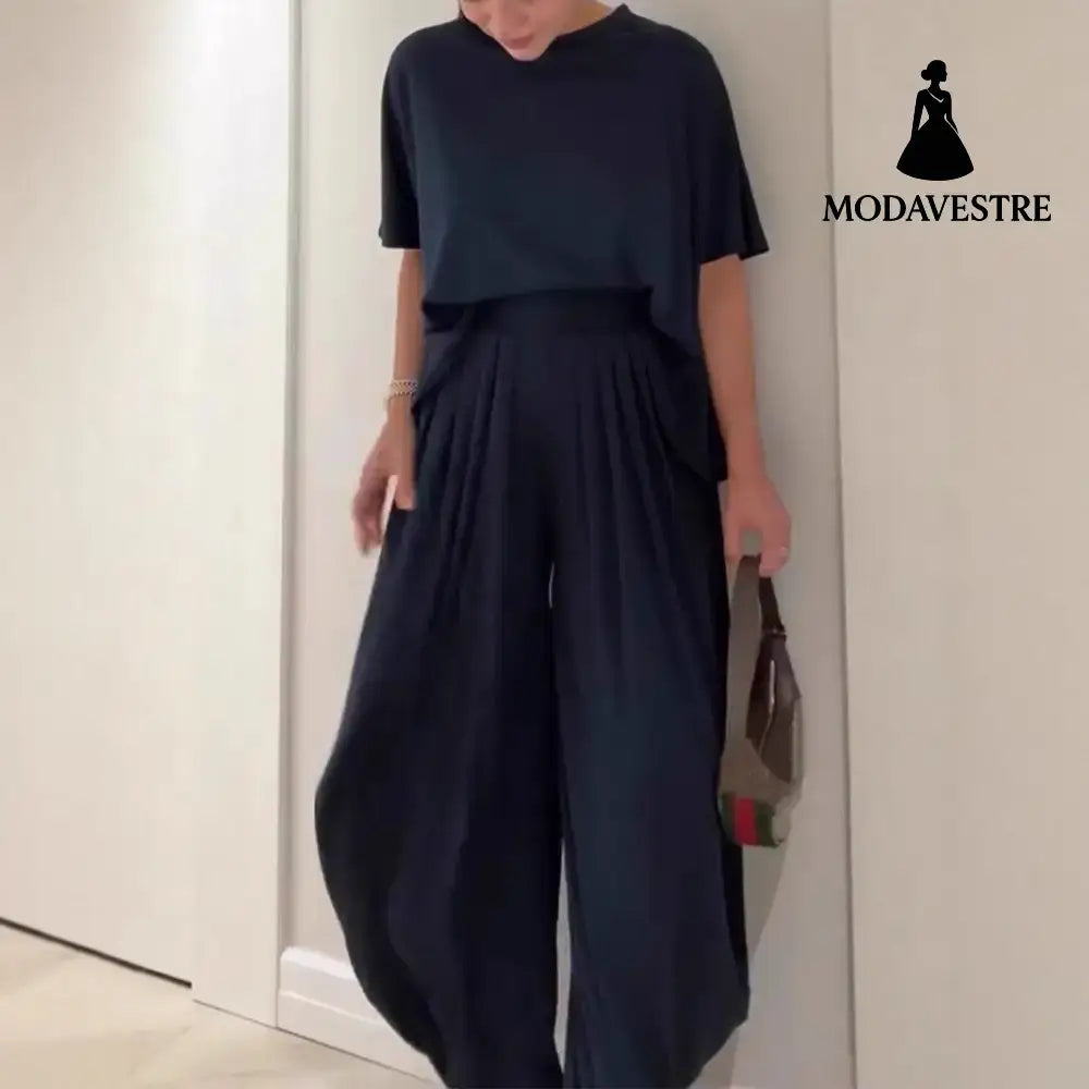 Solid Color Casual Loose Round Neck Wide Leg Pants Women’s Suit Dark Blue / 2XL Trousers